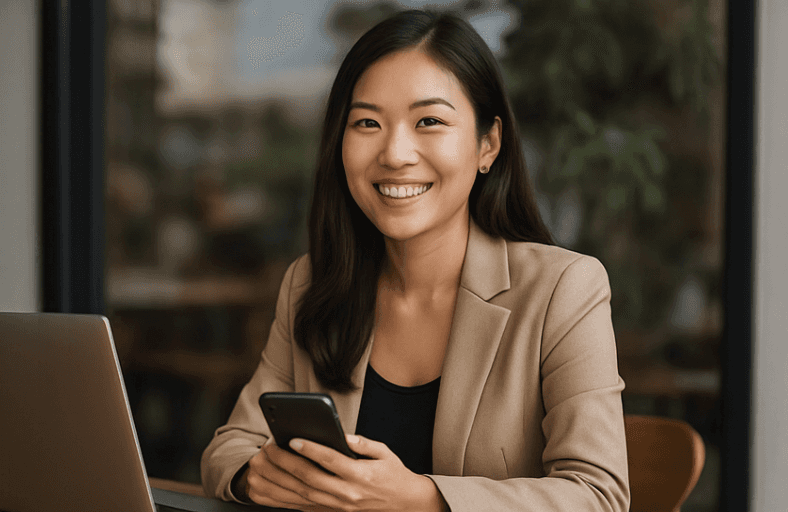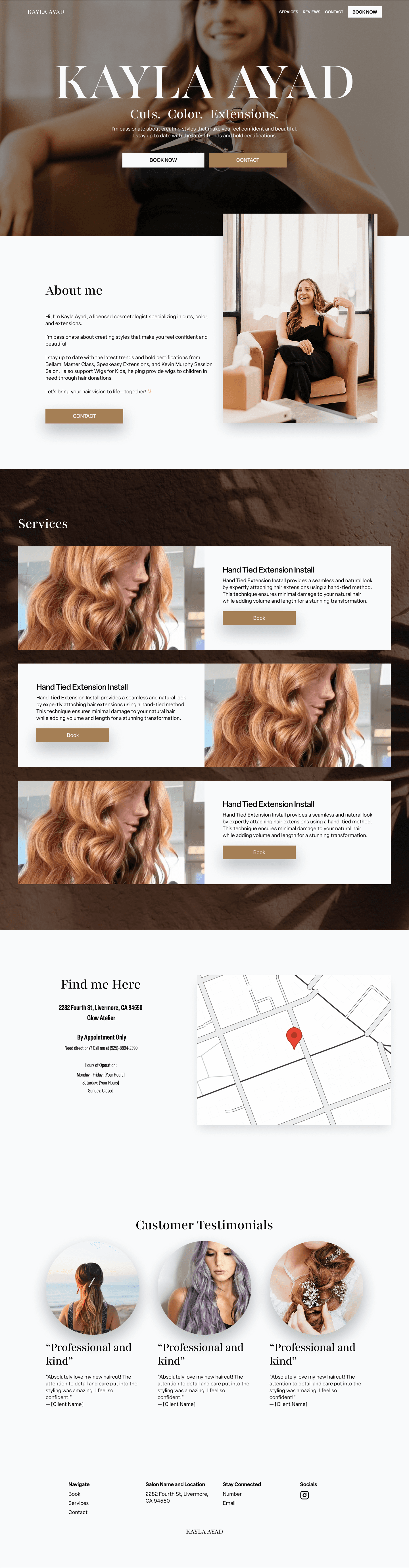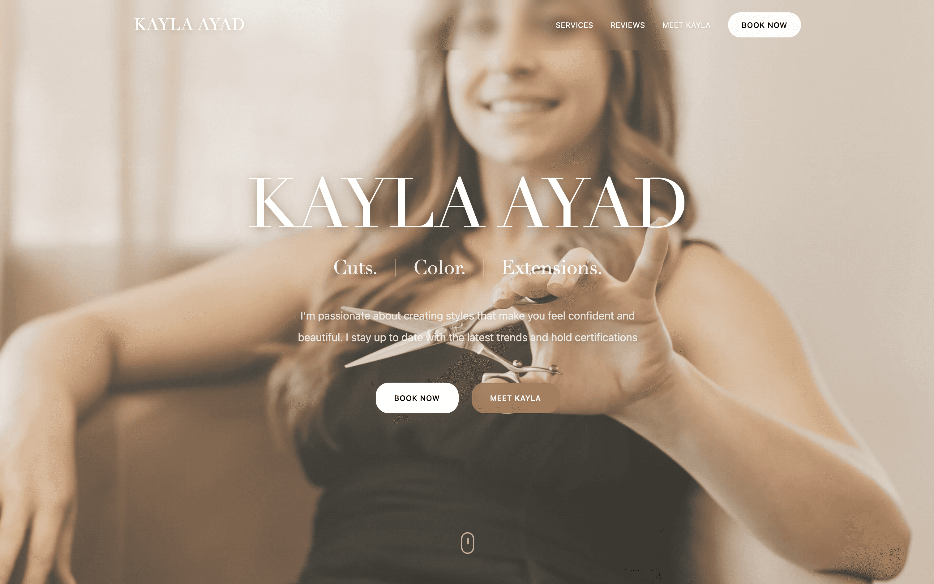 Jessica searches “hairstylist near me,” lands on Kayla’s site, scans services + work, and books right away through the online button.
