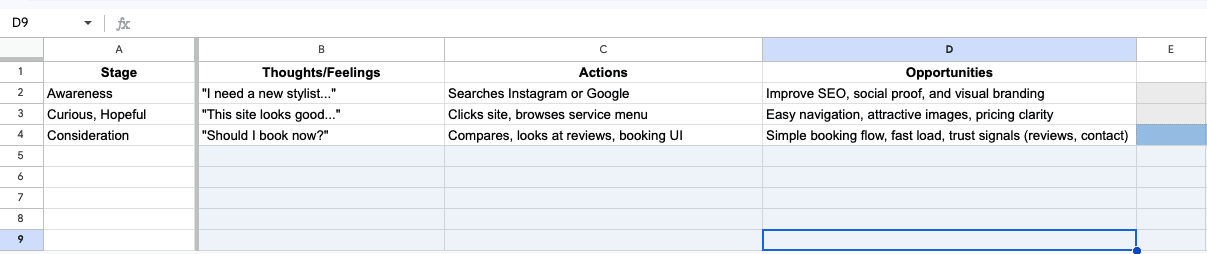 I mapped a simplified journey to understand how clients move from discovery to booking. The goal was to highlight where they hesitate (trust, service clarity, pricing) and make sure the site answers those questions quickly before guiding them to Vagaro.